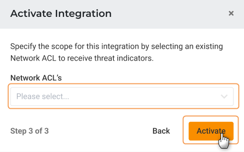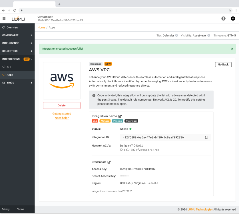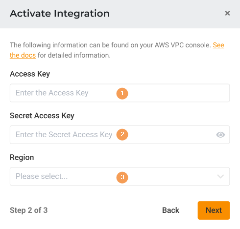 1. In the Lumu Portal, head to the panel on the left and open the Integrations drop-down menu. Then,click on Apps. Click on the Response tab on the right to filter the available integrations accordingly.2. Locate the AWS VPC integration.3. Familiarize yourself with the integration details and click the button Activate to start setting up the integration.4. Provide a meaningful Name. Under Threat Types, choose the specific threat mappings you want to push to AWS VPC. When done, click on the orange Next button.Please note that you cannot modify the information on this screen. Exercise caution when selecting Threat Types, as changes cannot be made later.5. Fill in the required information, the Access Key(1), Secret Access Key(2) and Region(3) obtained in Step 5 of the Attach Created Policy to User section. Finally, click on the Next button. Lumu will validate if the credentials provided are correct.You can find the AWS region in your browser's address bar. The part between https:// and .console.aws.amazon.com - that's your region identifier (for example, in https://us-east-1.console.aws.amazon.com, the region is us-east-1).6. In the next step, select the Network ACL where you want indicators to be pushed. This is the same one you configured in the Create a Network ACL section. Once selected click on the Activate button..7. The integration is now created and active. The Lumu Portal will display the details of the created integration.