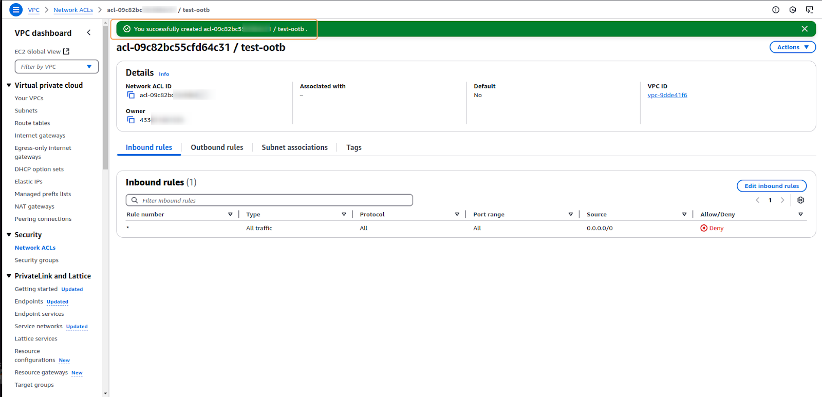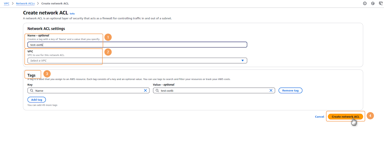 button.2. In the creation form that opens next, do the following:a. Enter a meaningful and descriptive Name(1) for your Network ACL.b. From the VPC(2) dropdown menu, select the Virtual Private Cloud (VPC) where this Network ACL will operate. The list will show all VPCs in your current region.c. Optionally, you can add key-value pairs under the Tags(3) section to help organize and manage your AWS resources.d. After reviewing the entered information, click on the Create network ACL(4) button to generate your new Network ACL.3. On the final screen, a confirmation of creation message will appear, as well as your newly created network ACL: