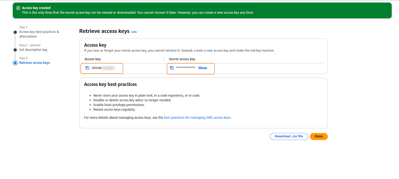 Access key ID Secret access keyTo exit this window click on DoneThis is the only time you'll be able to view the complete secret access key. Make sure to download the .csv file containing your credentials or copy and store the credentials securely. If you lose the secret access key, you will need to repeat the entire process.