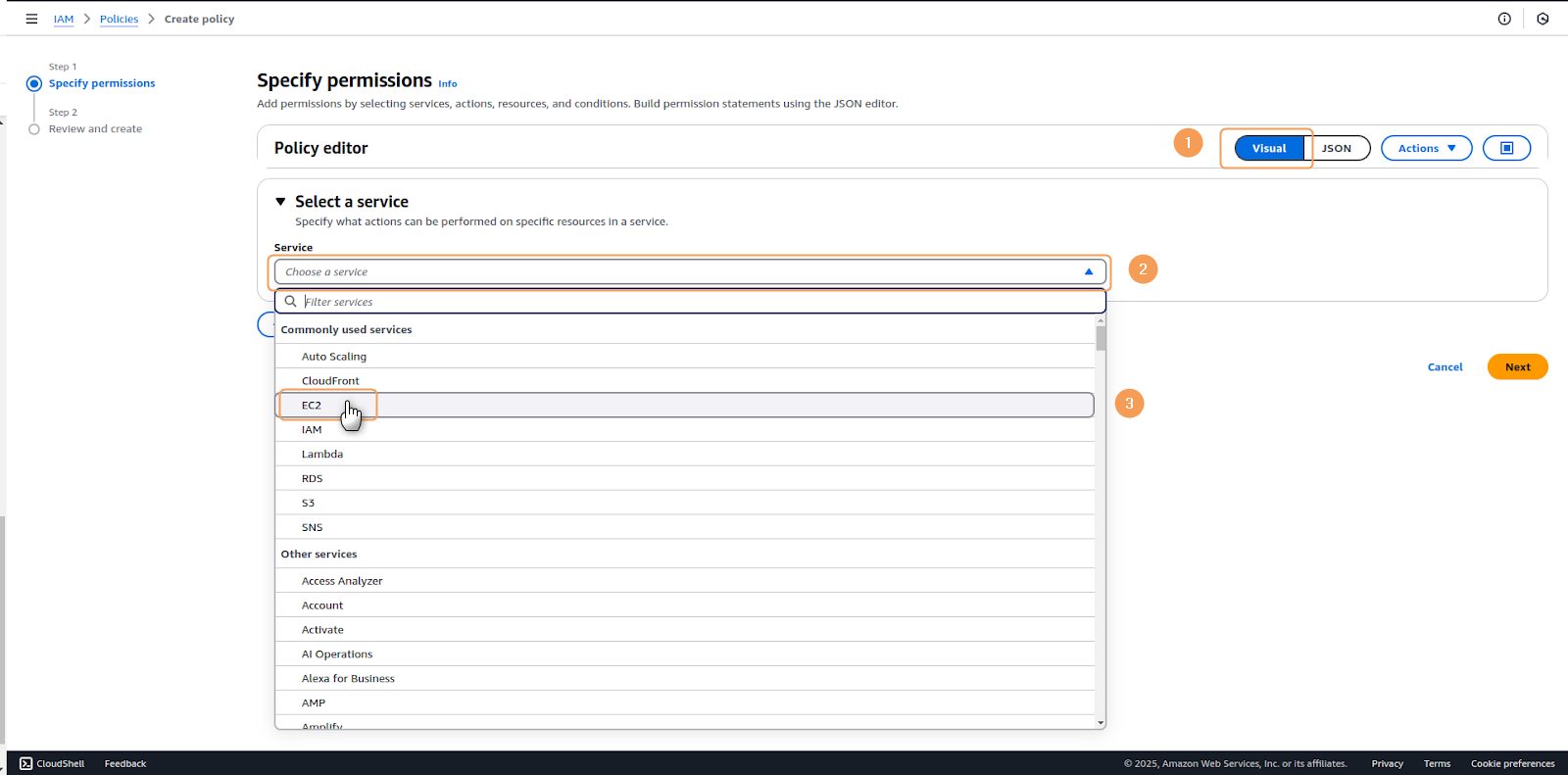 1. First, navigate to the IAM (Identity and Access Management) service within your AWS Management Console. You can quickly access this service using the global search bar at the top of the console.2. Navigate to the Policies section in the left navigation panel of the IAM dashboard.3. Select Create policy from the top right corner to begin the policy configuration process.4. In the policy creation interface, you have the option to use either the Visual editor or JSON editor. For this guide, we'll utilize the Visual editor for its intuitive interface. Begin by selecting Choose a service and search for EC2.5. In the permissions search bar, enter each of the following permissions and select their respective checkboxes to enable them