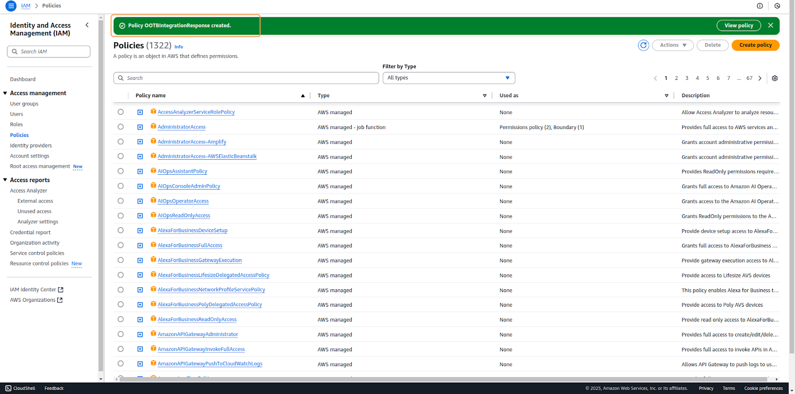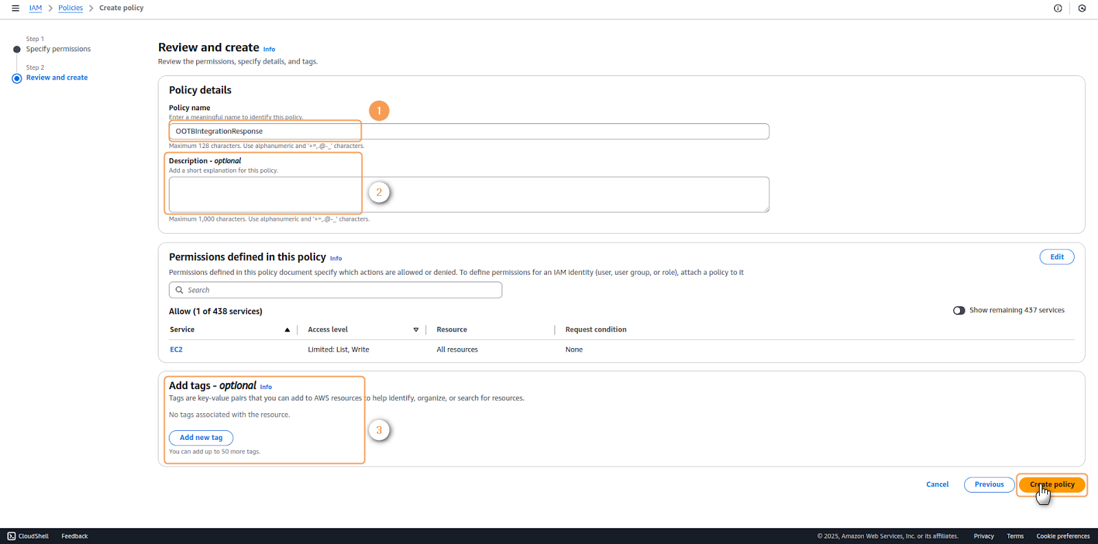 to proceed to the following step.7. After configuring the permissions, proceed to the Policy details section. Here, assign a descriptive Policy Name(1) that clearly identifies the policy's purpose. Optionally, you may also include a Description(2) and Tags(3) for better resource organization and management. The policy summary will display EC2 as the only service affected by these permissions.After reviewing your policy summary, click on Create Policy.For additional information about AWS tagging best practices, refer to the AWS documentation.8. Finally, a confirmation message will appear, indicating successful policy creation.