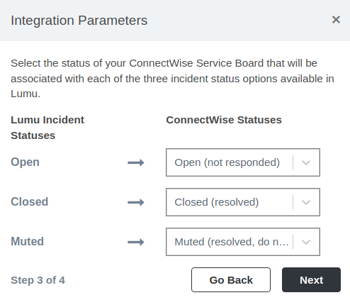 5. Select the statuses in ConnectWise PSA that correspond to the statuses of the incidents in the Lumu portal