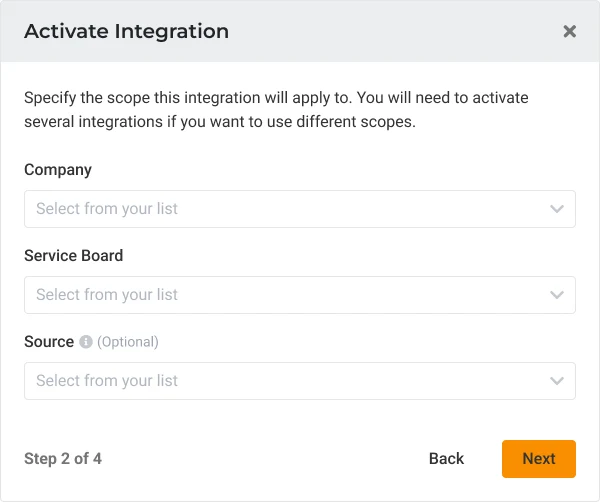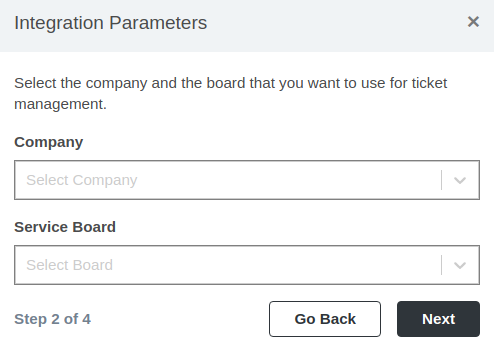 4. Select the company and the board the tickets created by the integration will be assigned to.
