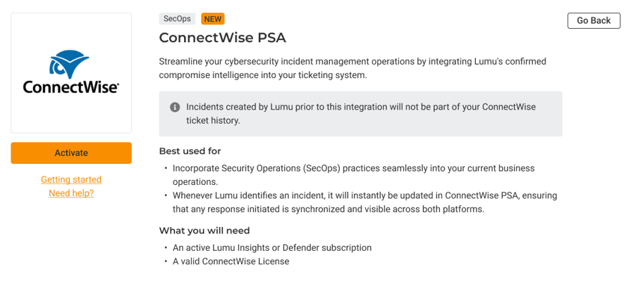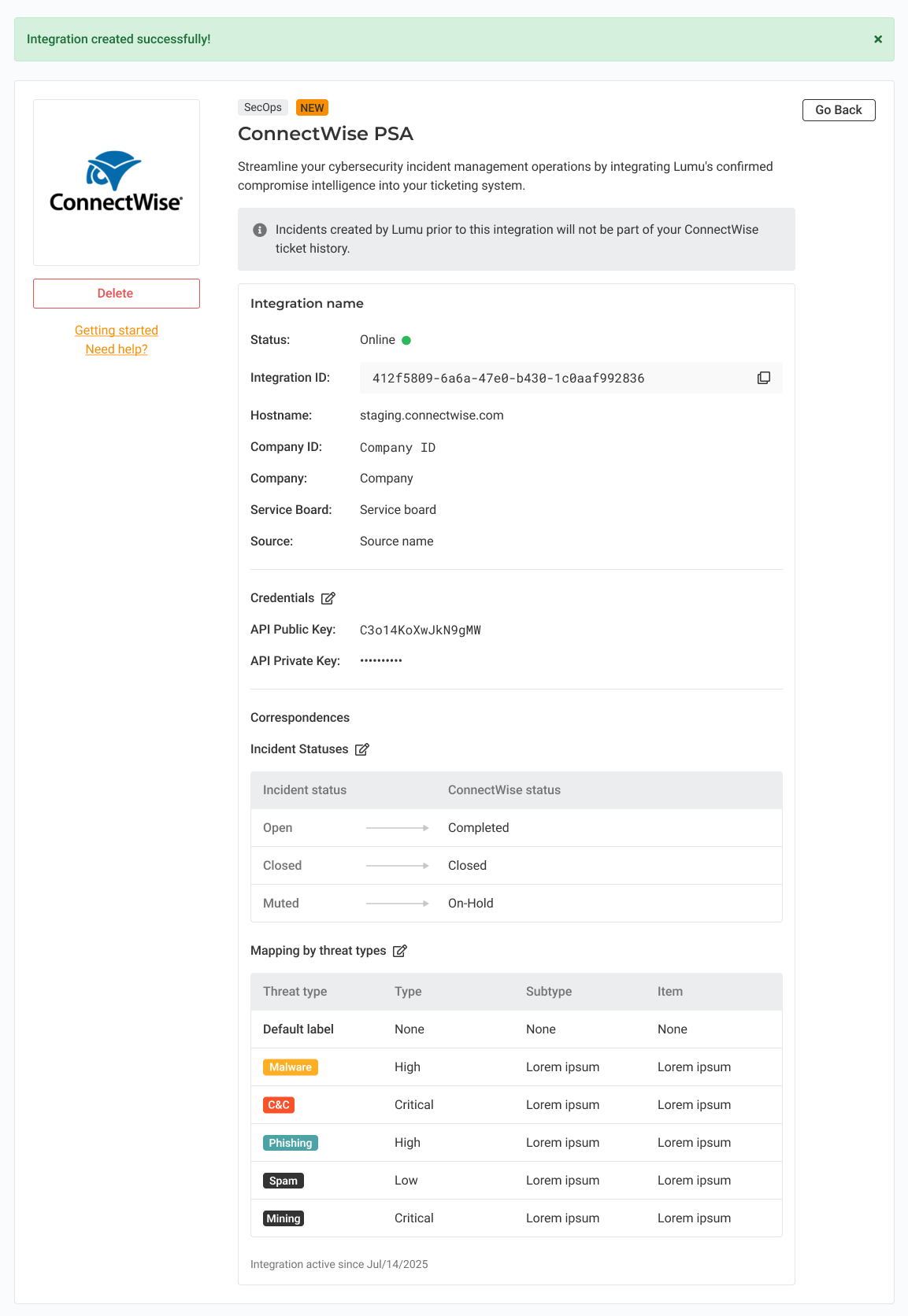 The ConnectWise PSA (formerly Manage) Out-of-the-Box Integration allows you to manage incidents detected by Lumu in your preferred ConnectWise PSA service board. A new service ticket will be created when Lumu detects an incident. Incident and related ticket status will be kept in sync between the Lumu portal and the ConnectWise PSA service board. As there are new contacts for the incident, the ticket will be updated with notes containing updated data.