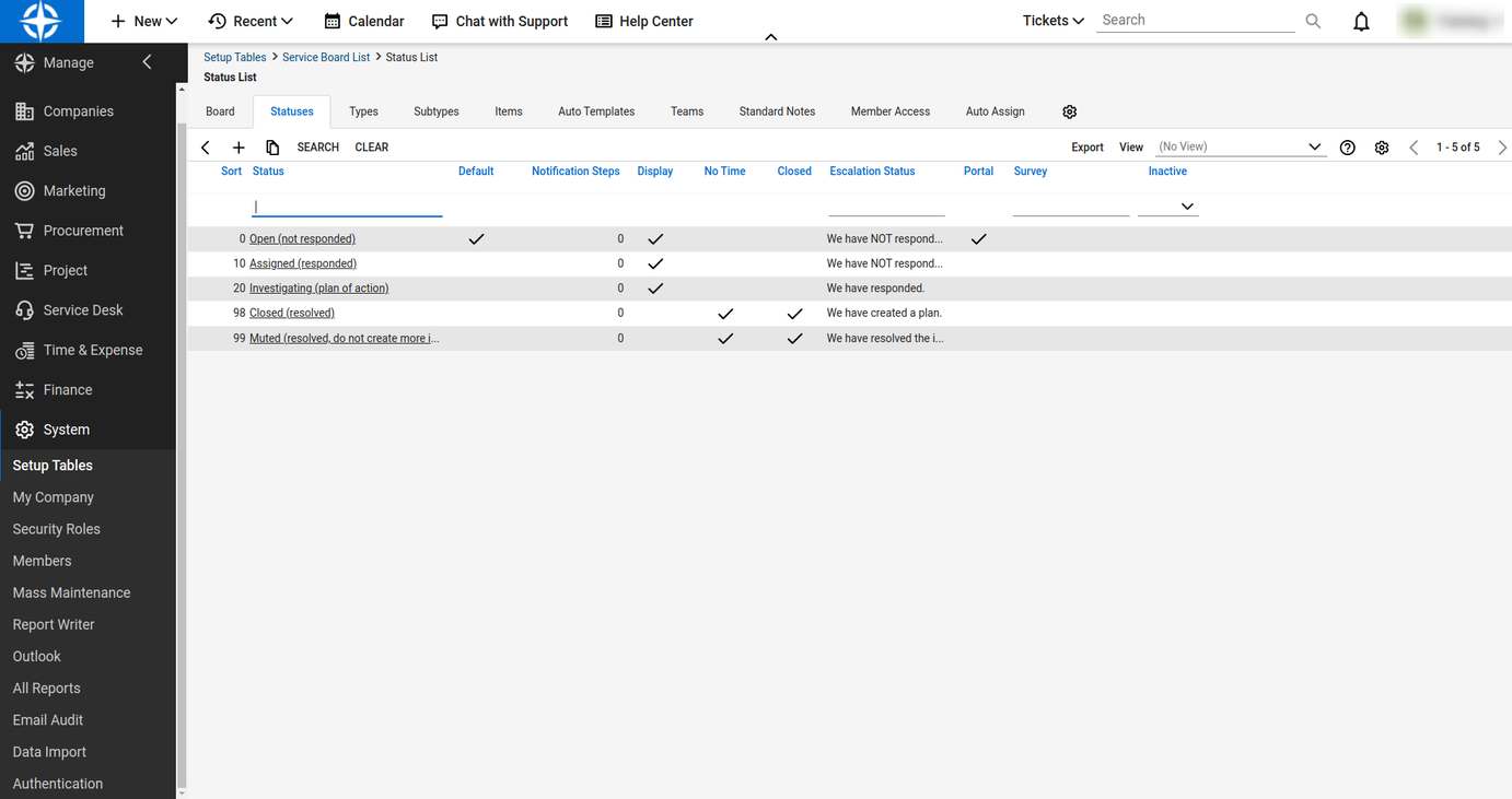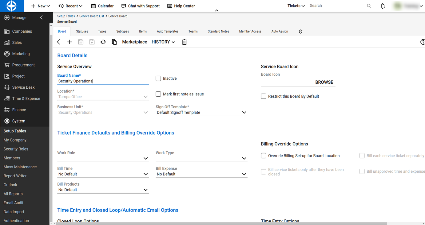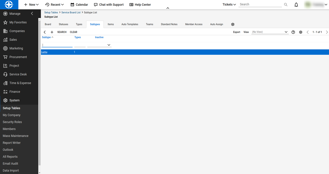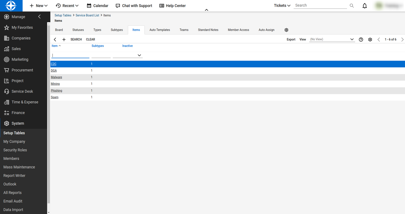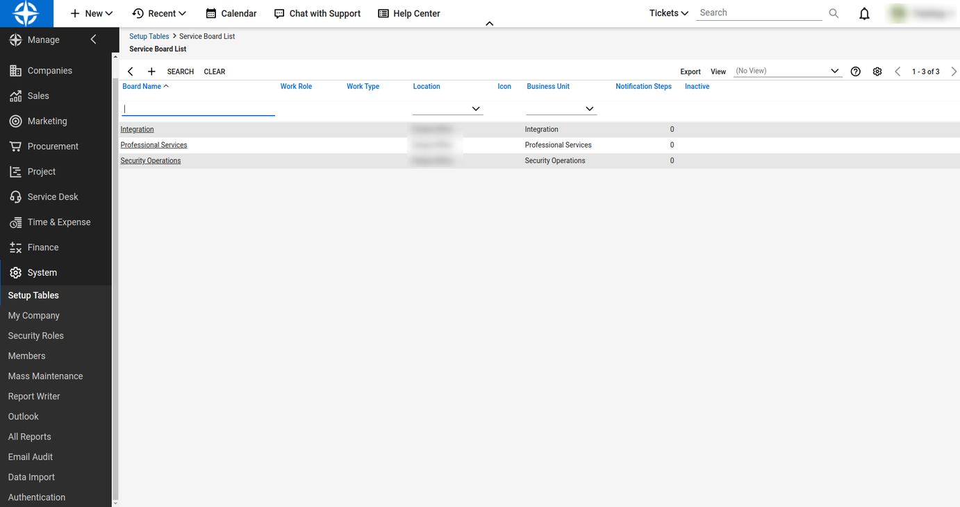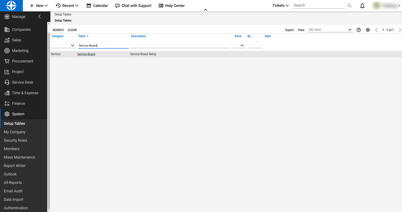 For every incident detected by Lumu, the integration will generate tickets in a Service Board of your choice. The integration creation process will list the available boards for you to choose from; however, should you need to create a new board, go to Setup Tables and search “Service Board” in the Table column. Click on the Service Board option.