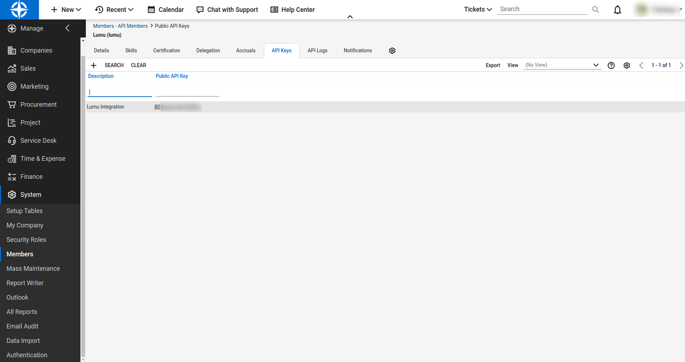 To generate the API key, select the API Member and go to the API Keys tab. Click the “+” button and fill out the required information. Public and private keys are then displayed. Save these keys as they are required for the integration. Please note that the Private Key is only available when the key is created.