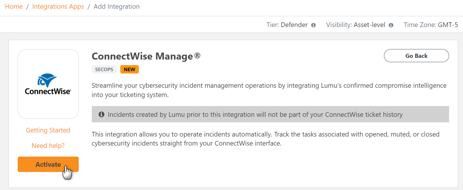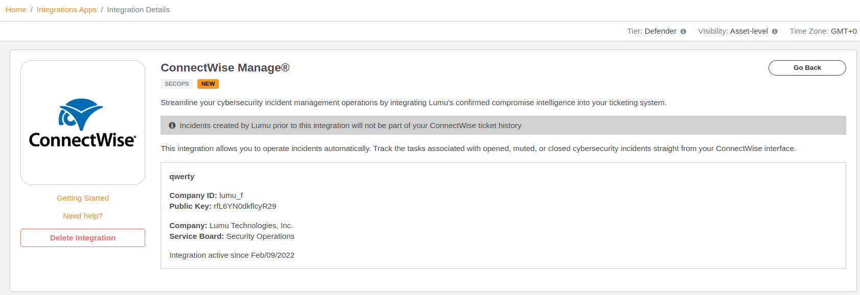 this article. The ConnectWise PSA (formerly Manage) Out-of-the-Box Integration allows you to manage incidents detected by Lumu in your preferred ConnectWise PSA service board. A new service ticket will be created when Lumu detects an incident. Incident and related ticket status will be kept in sync between the Lumu portal and the ConnectWise PSA service board. As there are new contacts for the incident, the ticket will be updated with notes containing updated data.