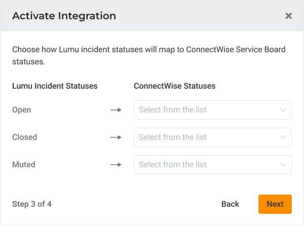 5. Select the statuses in ConnectWise PSA that correspond to the statuses of the incidents in the Lumu portal.