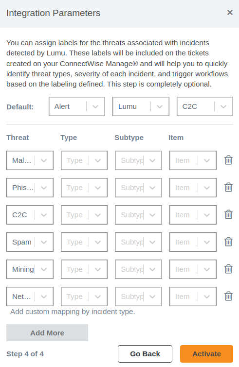 a. Optionally, select the type, subtype and item to be assigned to the tickets created by the integration. You can choose default values to be assigned to all tickets, and/or values to be used for each threat type. This step is optional and you can leave it blank if you do not wish to categorize the tickets.