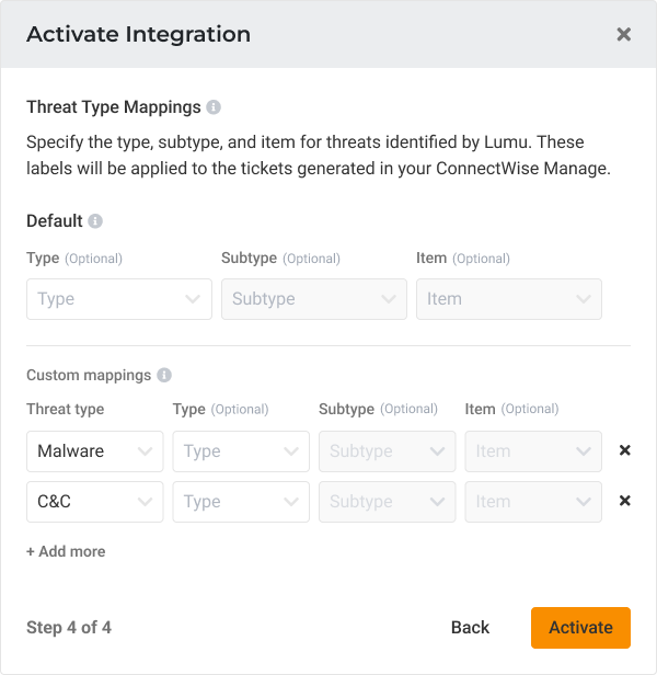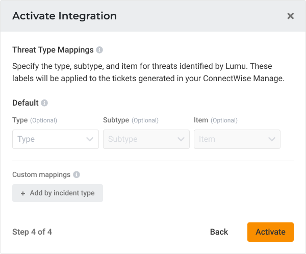 type, subtype, and item to the tickets created by the integration. You can choose a different categorization for each threat type if you wish to do so.