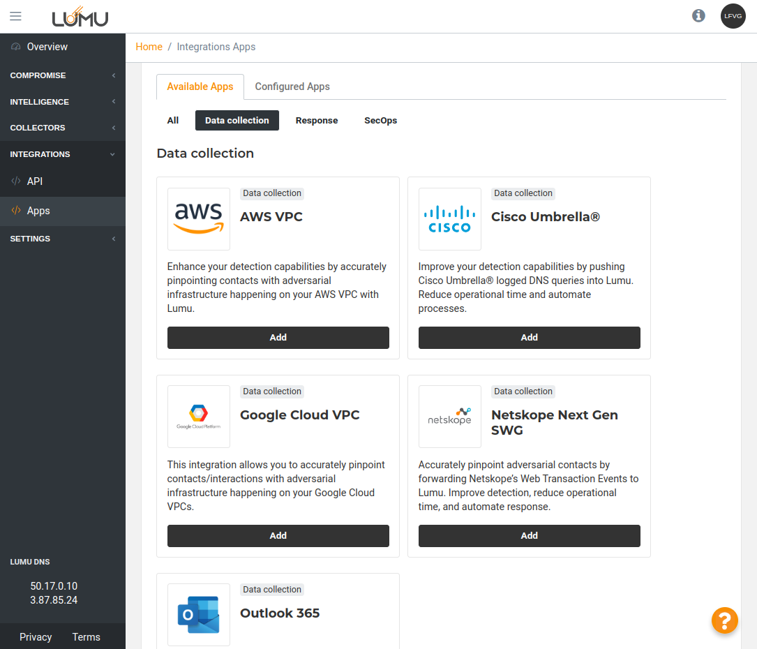 1. Log in to you Lumu account through the Lumu Portal and navigate to the integrations screen.