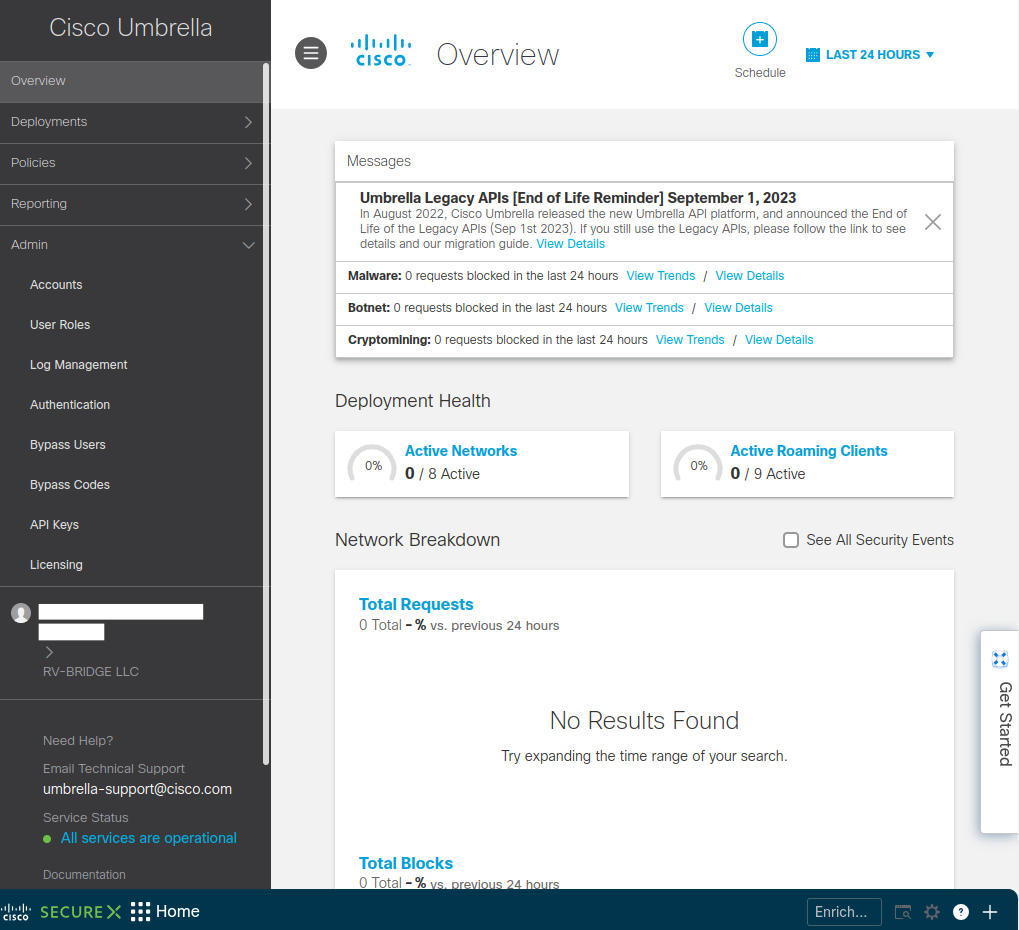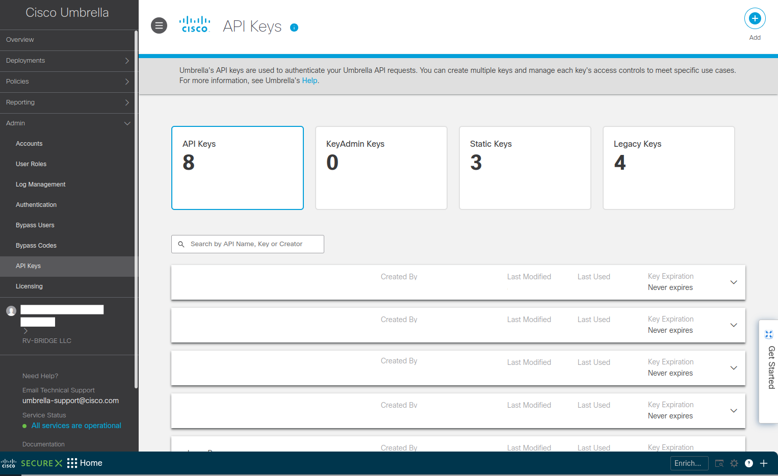 To interact with any of the Umbrella APIs, create an API Key in the Cisco Umbrella portal and use the credentials to obtain an access token for making requests. To do so, follow the steps bellow: