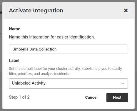 4. To activate integration, add a Name and select the Label. It is always recommended to assign a label to organize and categorize the traffic of your organization. Click Next.
