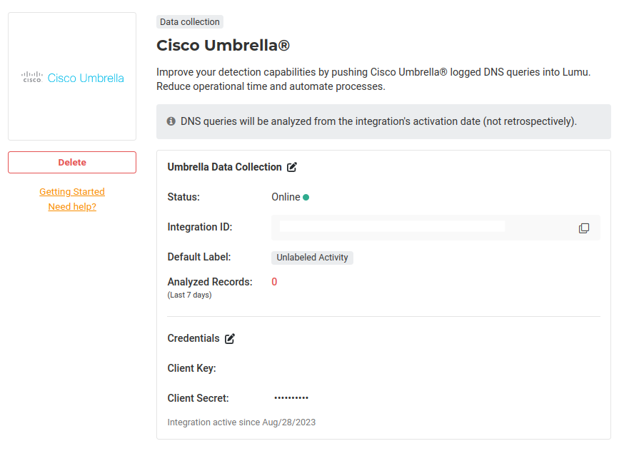 The integration is now created and active. Now, the Lumu Portal will display the details of the created integration: