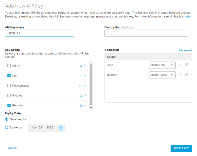 To learn more about Out-of-the-box Integrations and their benefits, please refer to this article. Requirements A Cisco Umbrella DNS Security Essentials subscription package or above Lumu Defender Subscription Setup Cisco Umbrella Rest API Client To ...