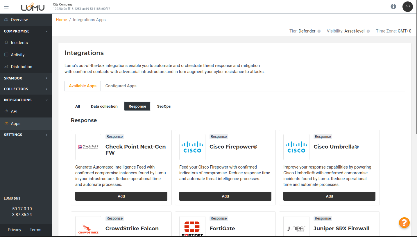 1. Log in to your Lumu account through the Lumu Portal, navigate to the Integrations screen and select “Response”.