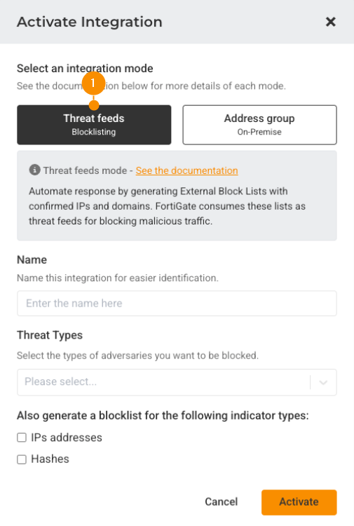 4. Select the Threat Feeds (1) mode in the Activate Integration window. Then, give the integration a distinctive Name, select the Threat Types you want to include. If needed, you can opt to generate blocklists for IPs and Hashes by selecting their corresponding toggles. When done, click Activate.