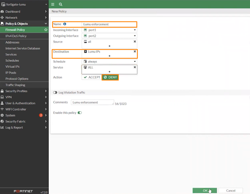 5. Create a new Firewall Policy to block IP addresses from the Lumu IP threat feed.