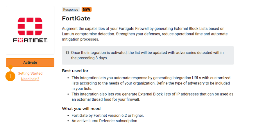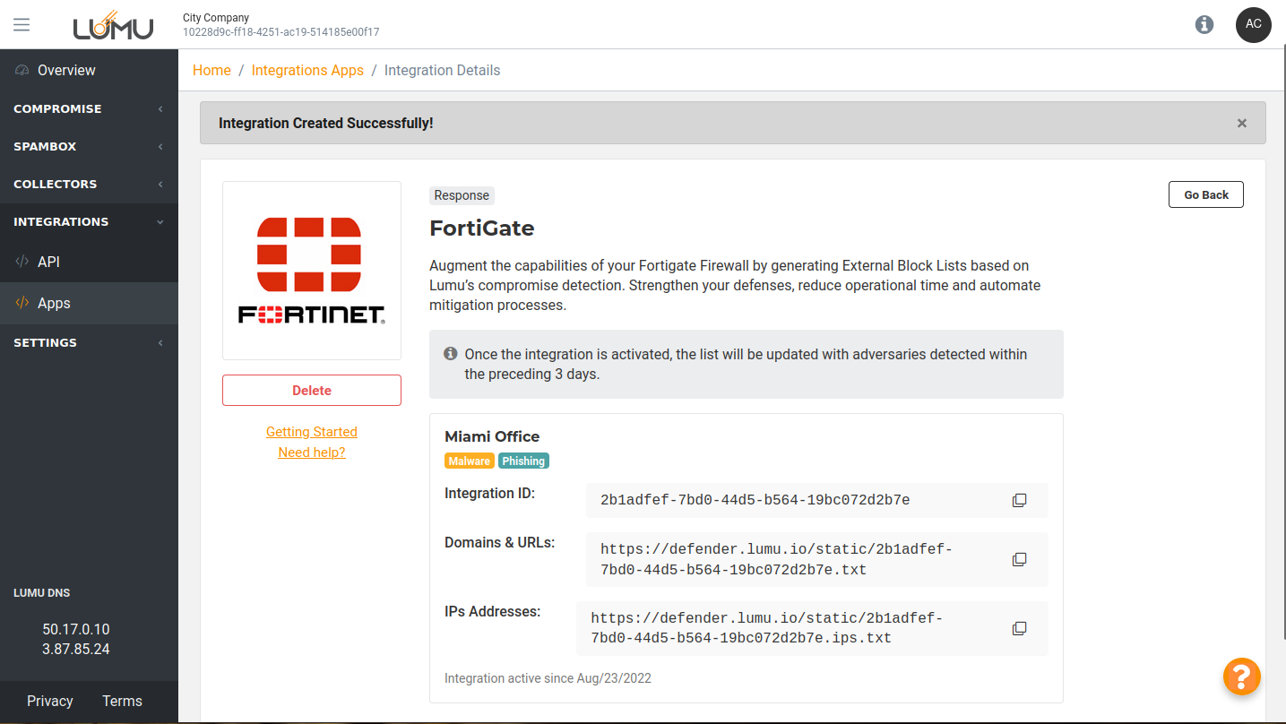 5. Once you create the integration, you’ll be provided configuration keys to block domains, URLs, and IP addresses, along with the integration URLs. These will be added to configure threat feeds within Fortinet’s environment.