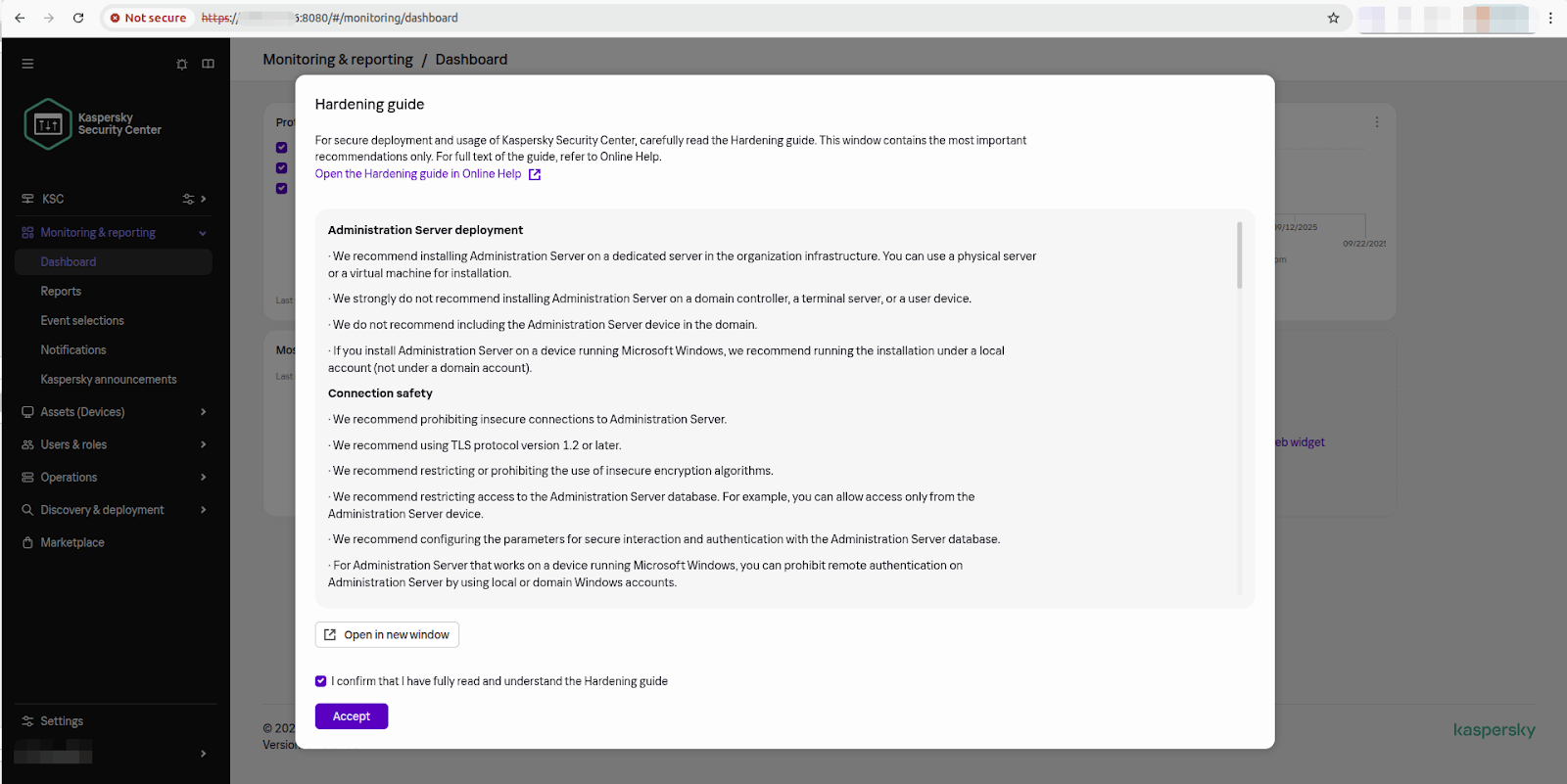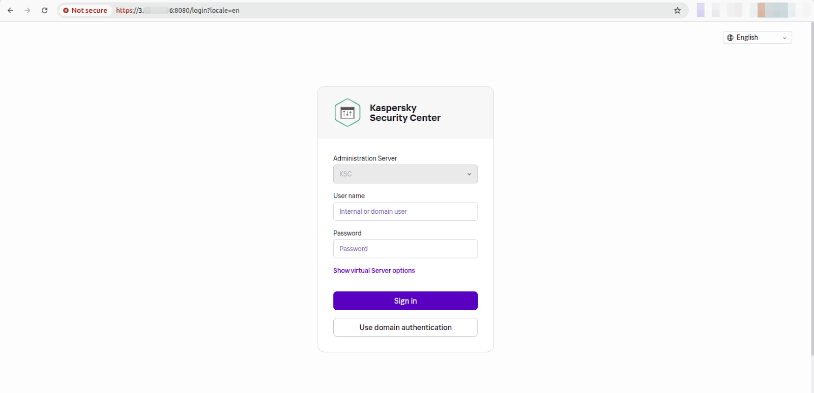 1. Browse the Kaspersky Web URL to verify the page loads correctly. The IP address and port are needed for integration, keep them at hand for later use.