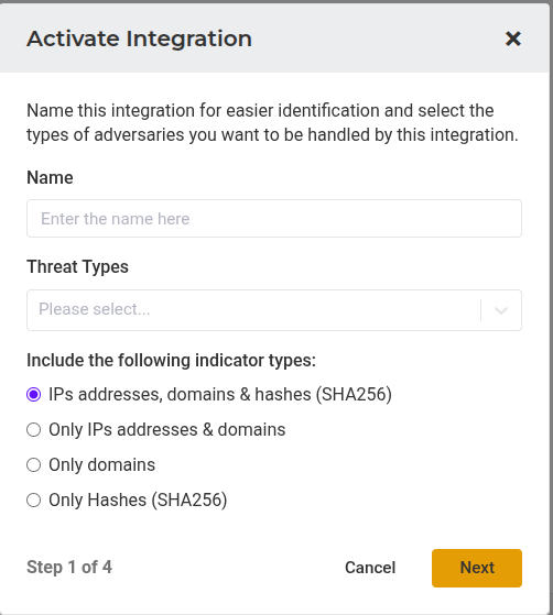 4. Give the integration a distinctive Name, select the Threat Types to include, and choose one of the following options based on the integration's purpose: IPs addresses, domains & hashes, Only IPs addresses & domains, Only domains, or Only Hashes. When finished, click Next.