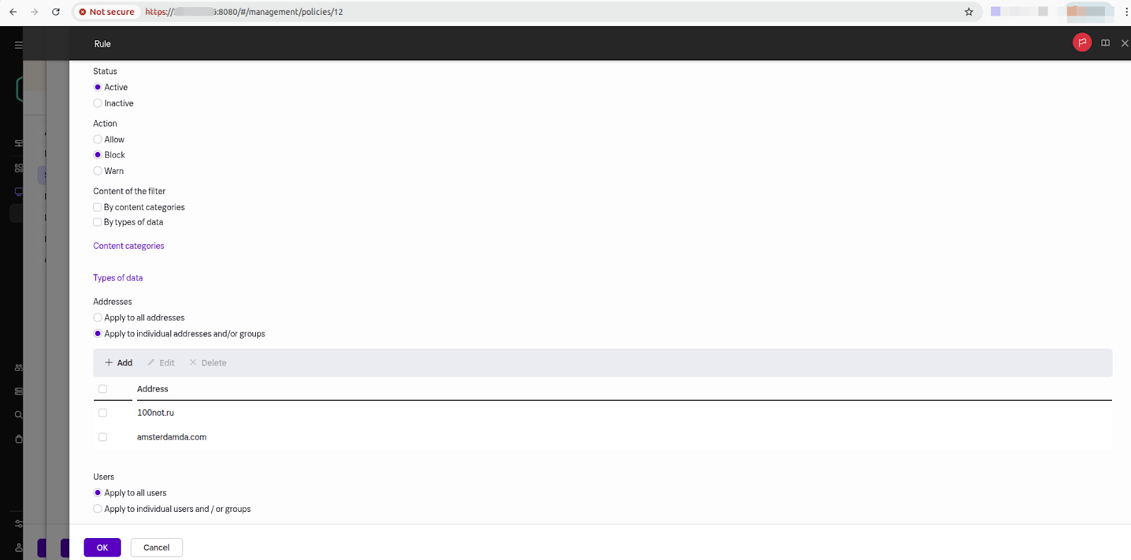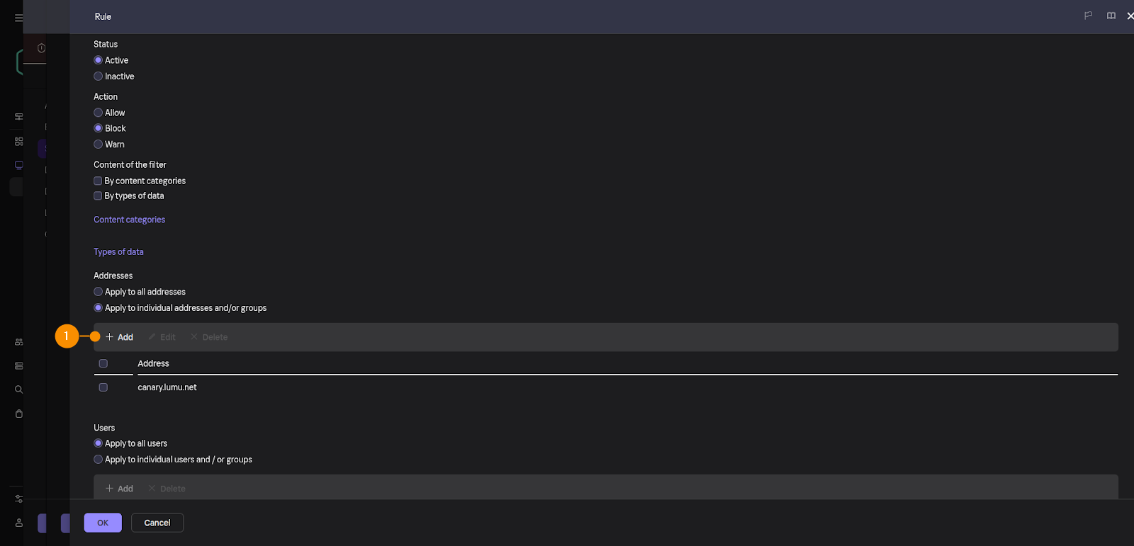 4. Assign a name and follow the image below. Select Apply to individual addresses and/or groups (1) under the Addresses section, then add canary.lumu.net. Once finished, click OK and then Save to finish configuring the policy.