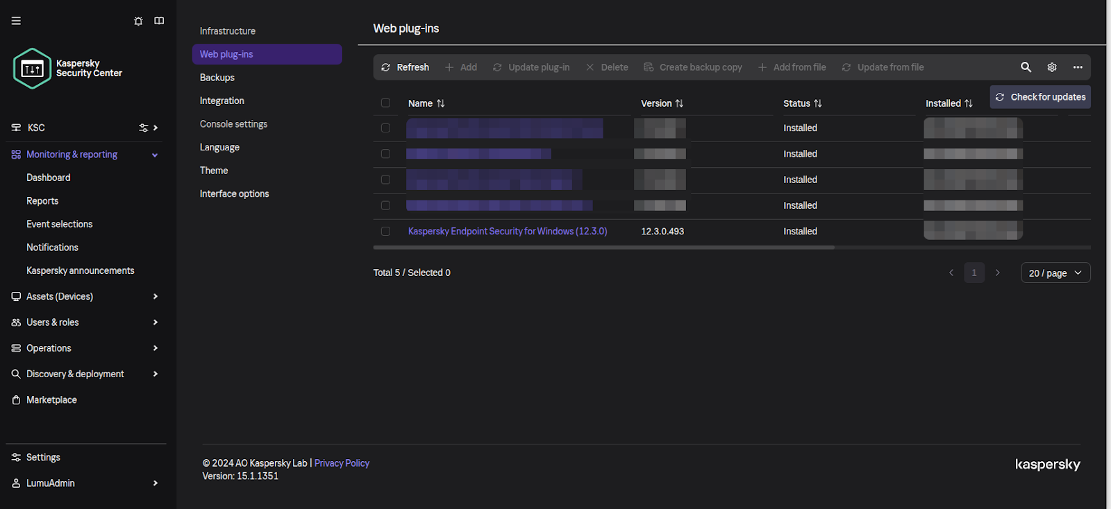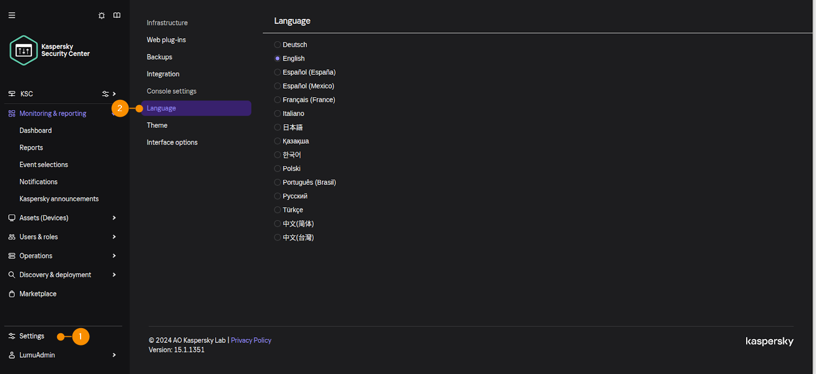 2. Log in to the web console. In the left panel, go to Settings (1) and select Web plug-ins (2). Check if you have installed the Windows Policy. If it is not, ask your Kaspersky operator to install it.