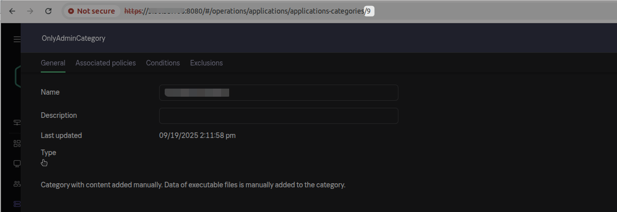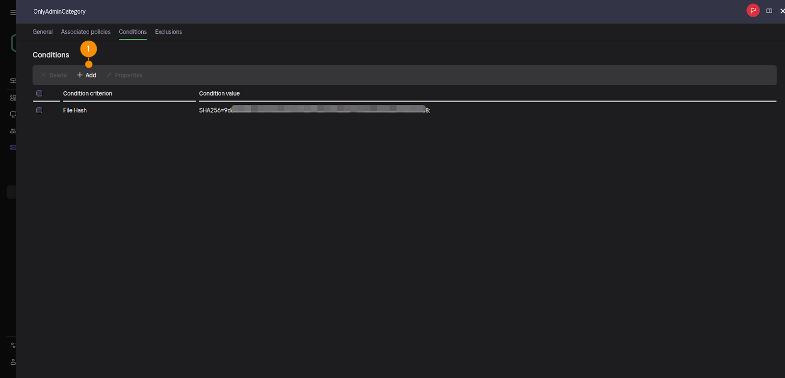 2. KSC does not allow the creation of an empty Application category. You must specify at least one condition. Go to the Conditions tab and click on + Add (1) to include one.