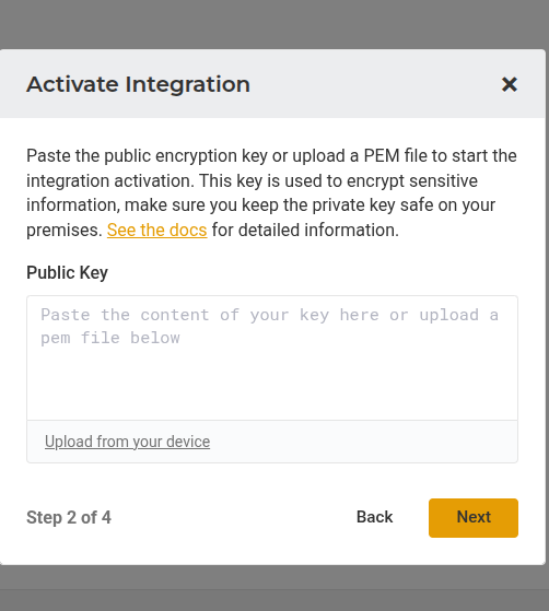 5. In the next window, you must enter the Public Key generated in Step 2 of the Generate the encryption keys section. You can do so in two different ways: