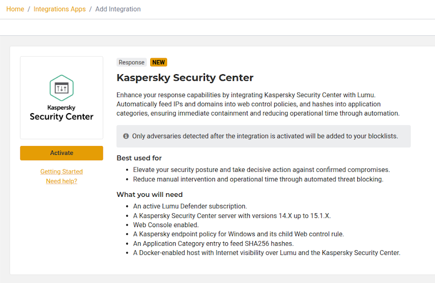 This article guides you through the integration process of Kaspersky Security Center with Lumu for automated response procedures. This is one of our featured Out-of-the-Box Response Integrations.