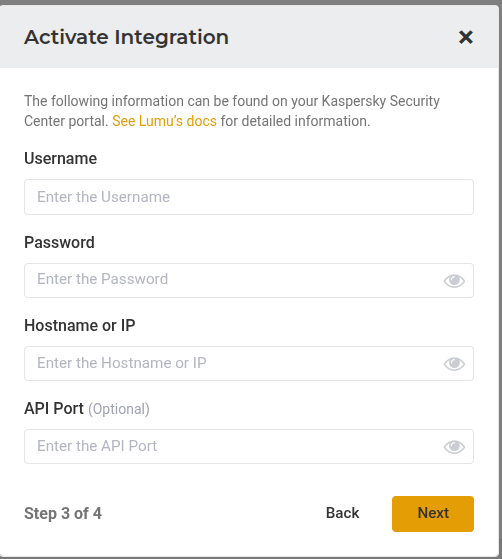 6. The next window will ask you to fill in the following information to connect to your Kaspersky Security Center Web Console: