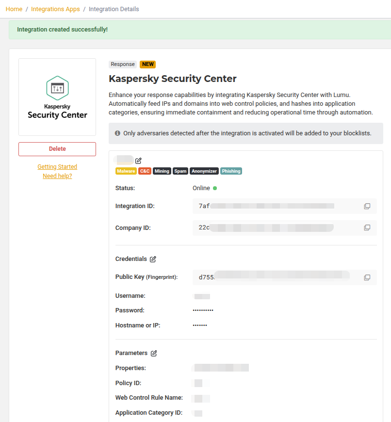 8. The integration is now created and active. Now, the Lumu Portal will display the details of the created integration: