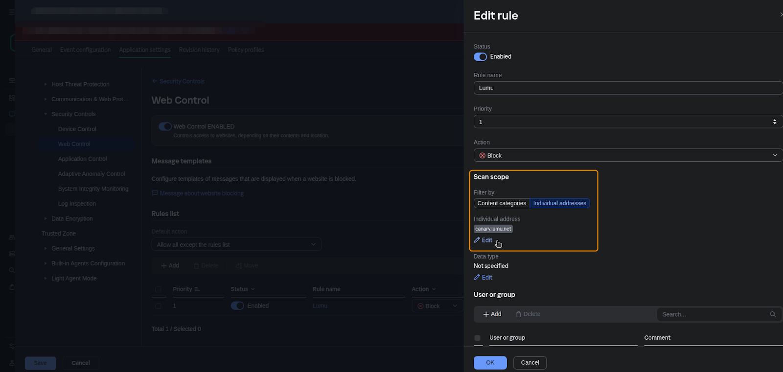 4. Assign a name and follow the image below. Select Individual addresses under the Scan scope section, then add canary.lumu.net. Once finished, click OK and then Save to finish configuring the policy.