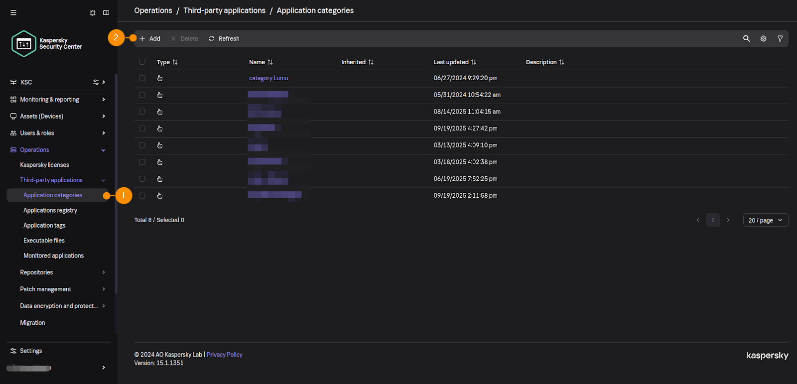 1. Navigate to Operations → Third party applications, then click on Application categories (1) and click on + Add (2).
