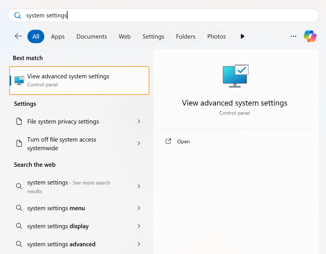 3. Open your system settings by opening the Start menu and search for System Settings. The View Advanced System Settings app will appear, click on it.