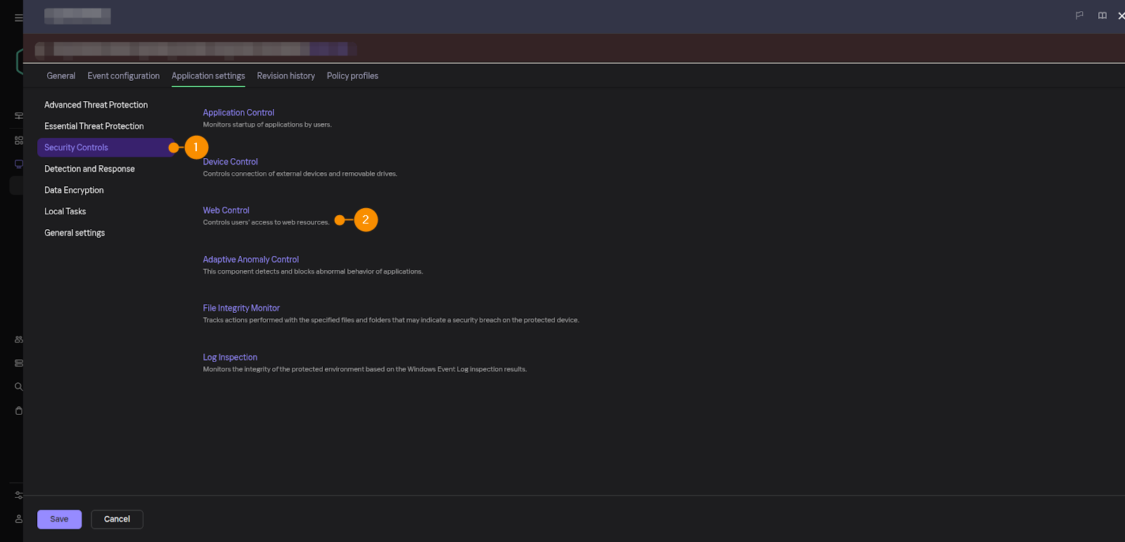 2. Go to the Application settings tab, then select Security Controls (1) and click Web control (2).