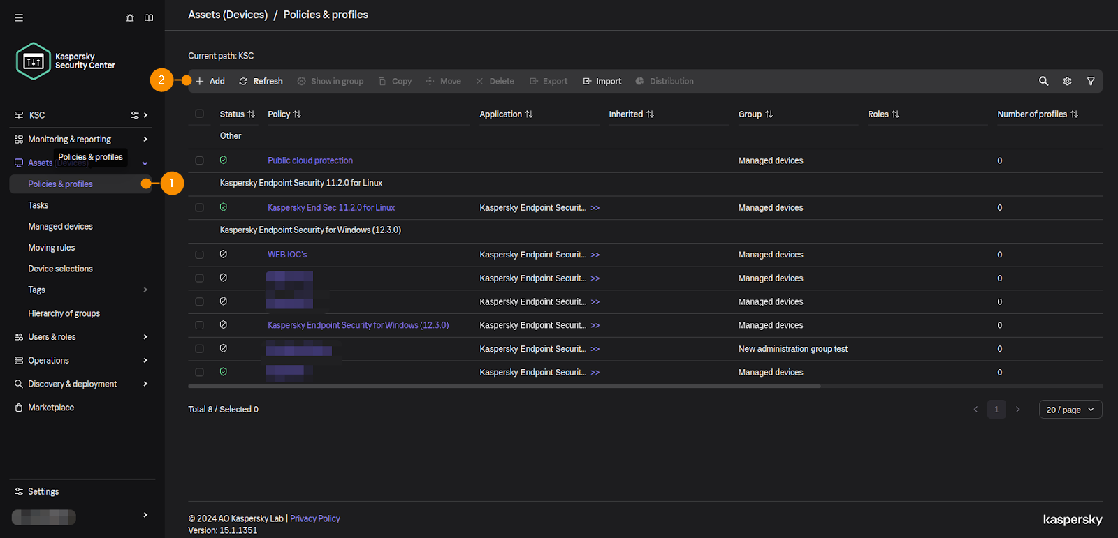 1. Go to Policies & profiles (1) under Assets/Policies, and click Add (2).