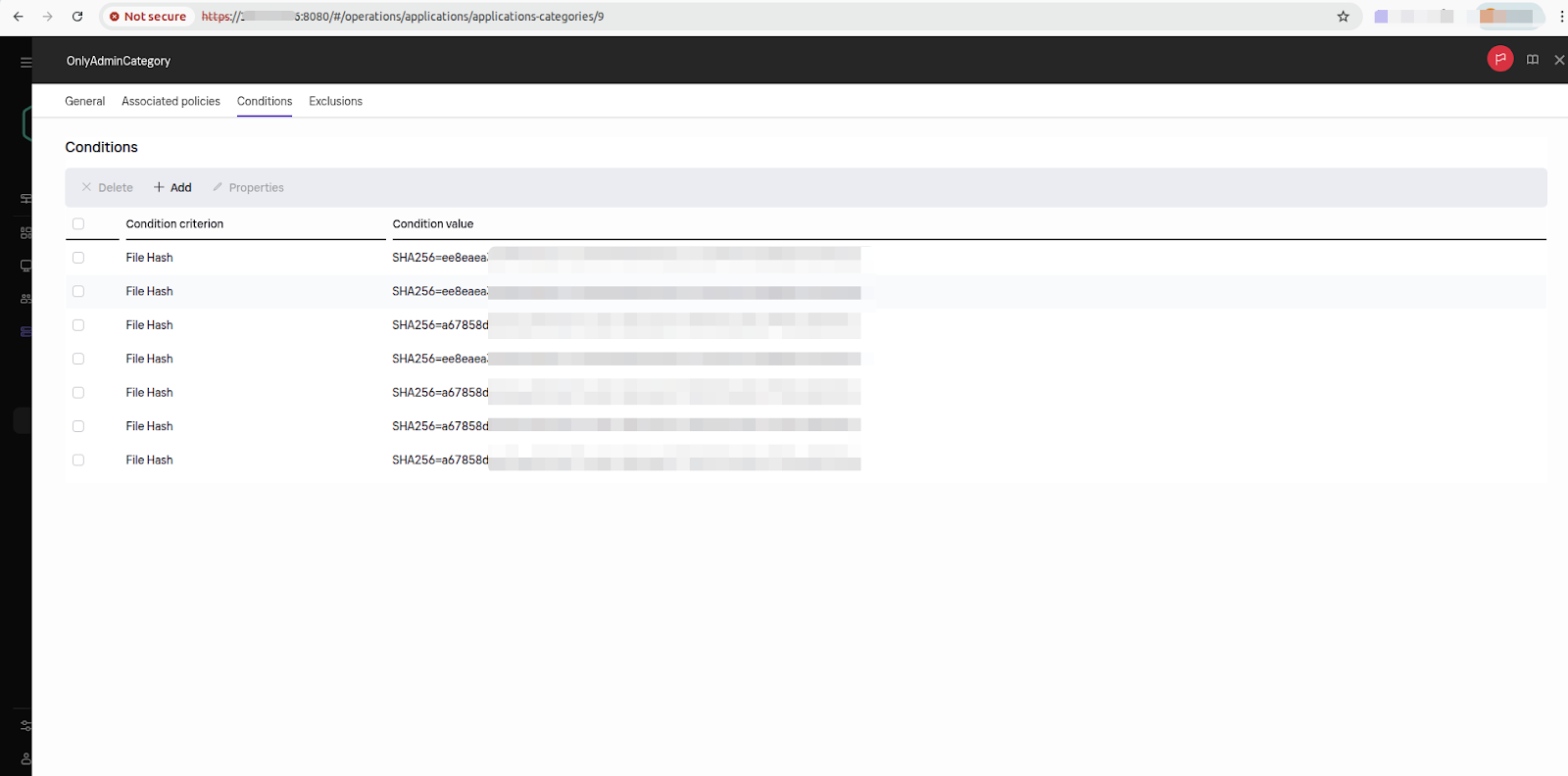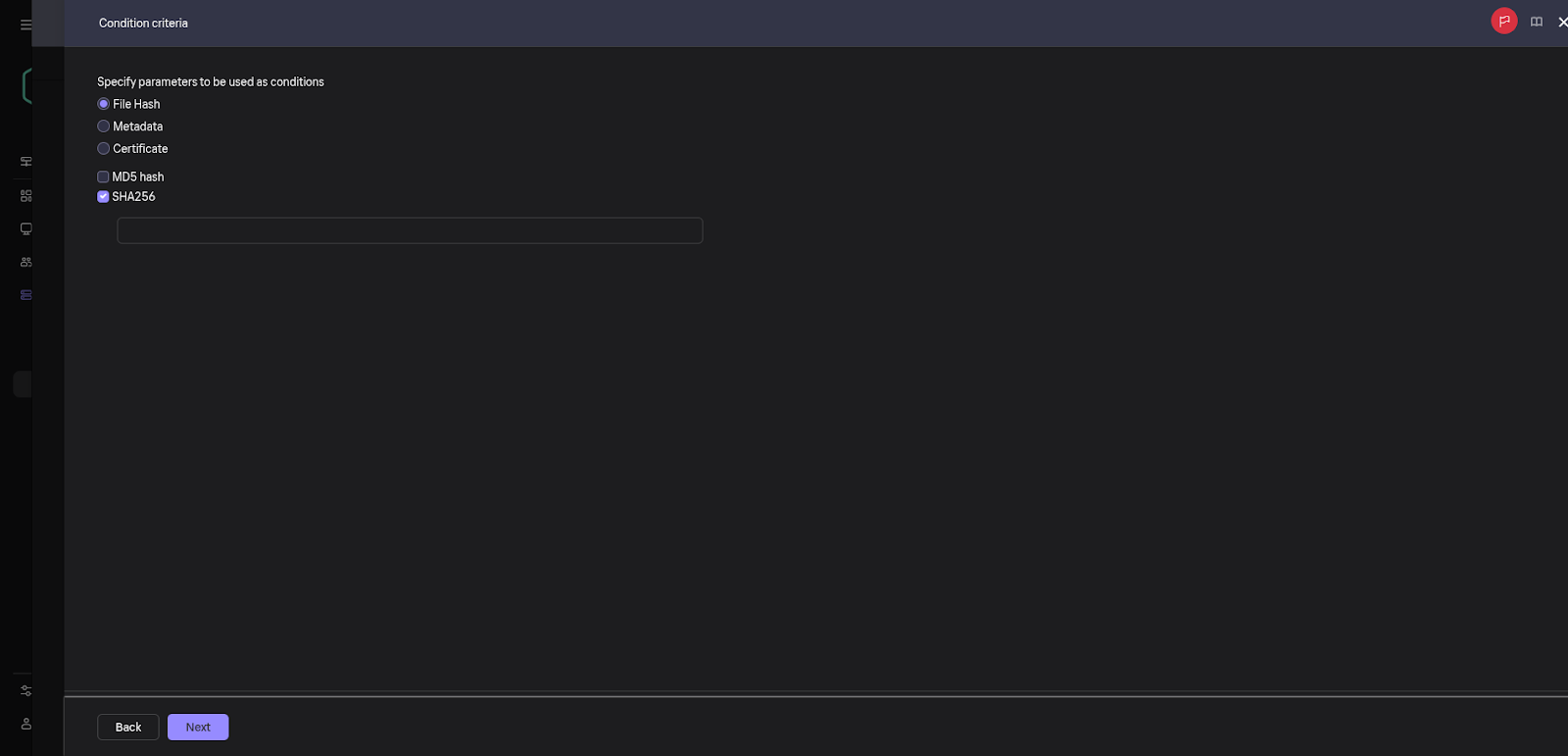 You will also find a new sha256 hash indicator, if available, in the Application category condition tab of the relevant integration category.