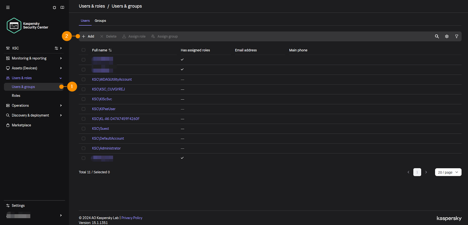 1. Click on Users and groups (1) under the User & roles section. Then, click on + Add (2).