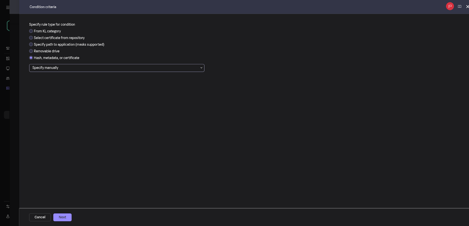 3. Choose the Hash, metadata, or Certificate option and select Specify manually from the dropdown. Then click Next.