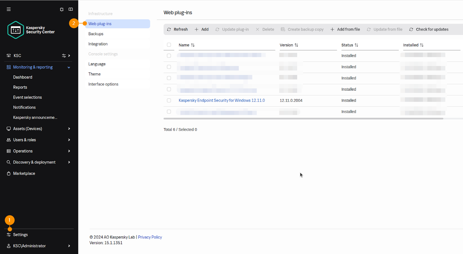 2. Log in to the web console. In the left panel, go to Settings (1) and select Web plug-ins (2). Check if you have installed the Windows Policy and review the version you have installed. If it is not, ask your Kaspersky operator to install it.