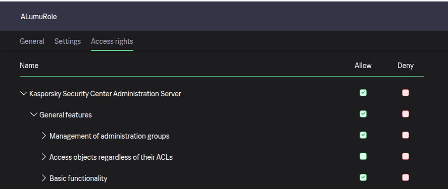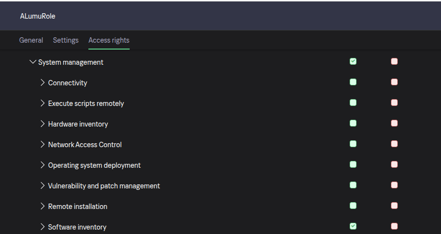 2. Select a name for the new role. Then, go to the Access rights tab. Follow The Principle of Least Privilege and assign the Access rights as shown below.