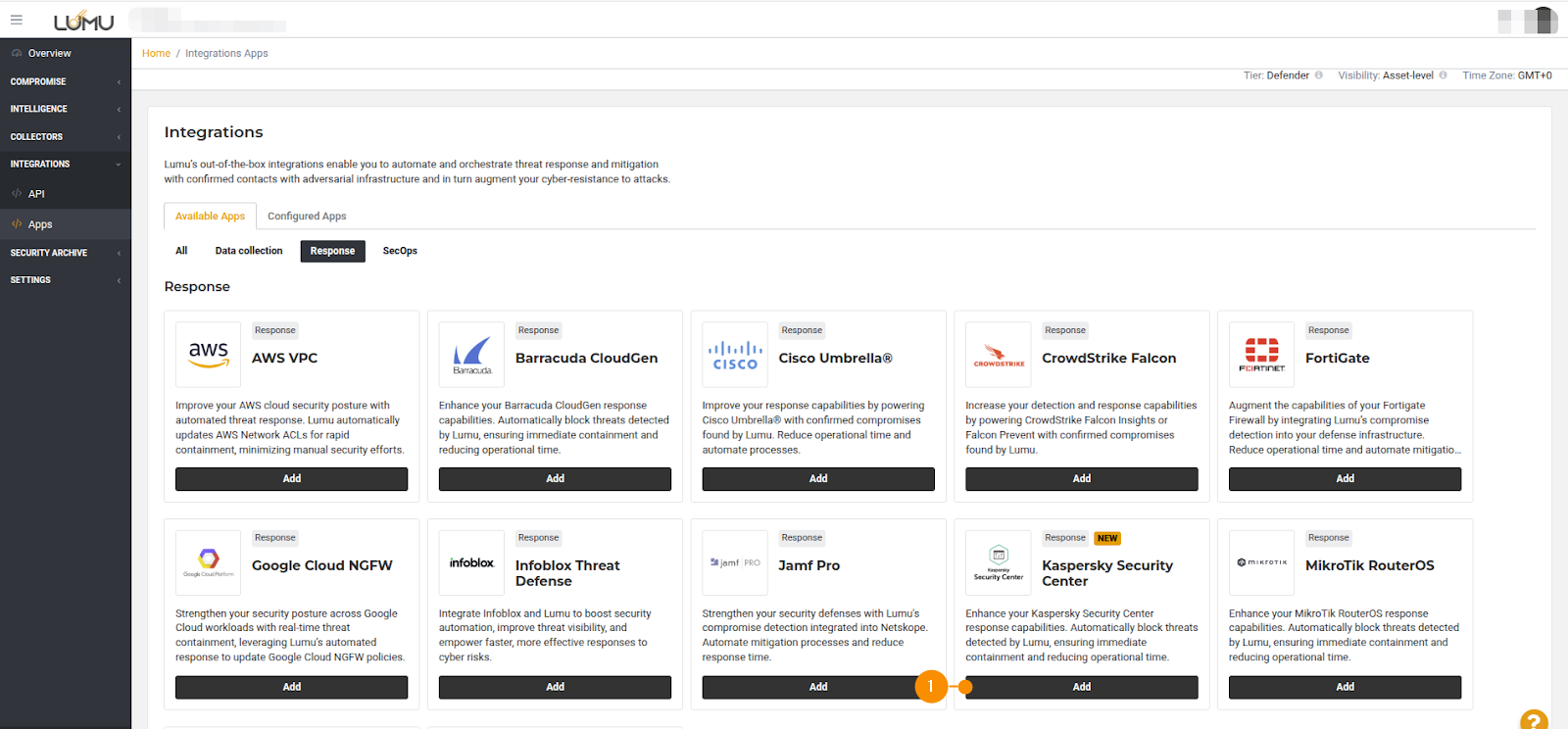 2. Locate the Kaspersky Security Center integration in the Response section on the available apps area. Click Add (1) to view its details.