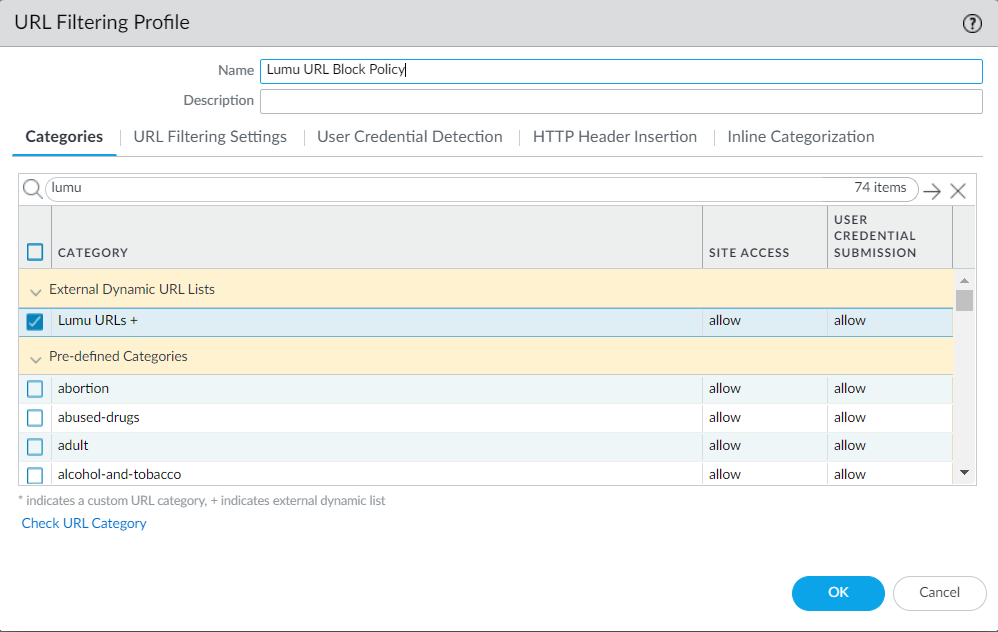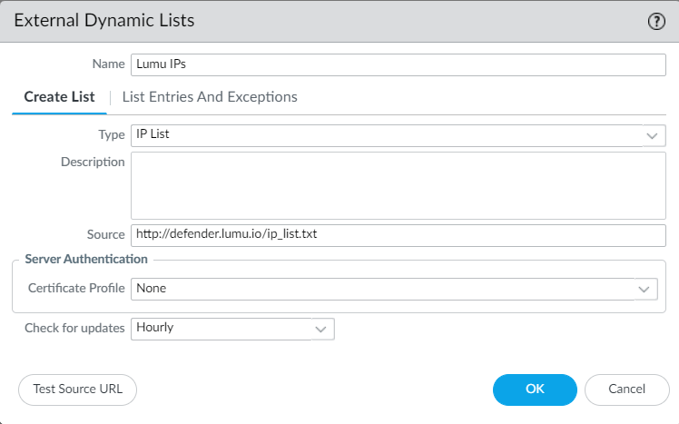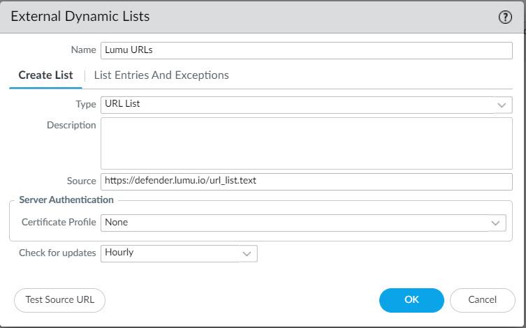 - Under Objects > External Dynamic Lists, add a new External Dynamic List of type URL List.