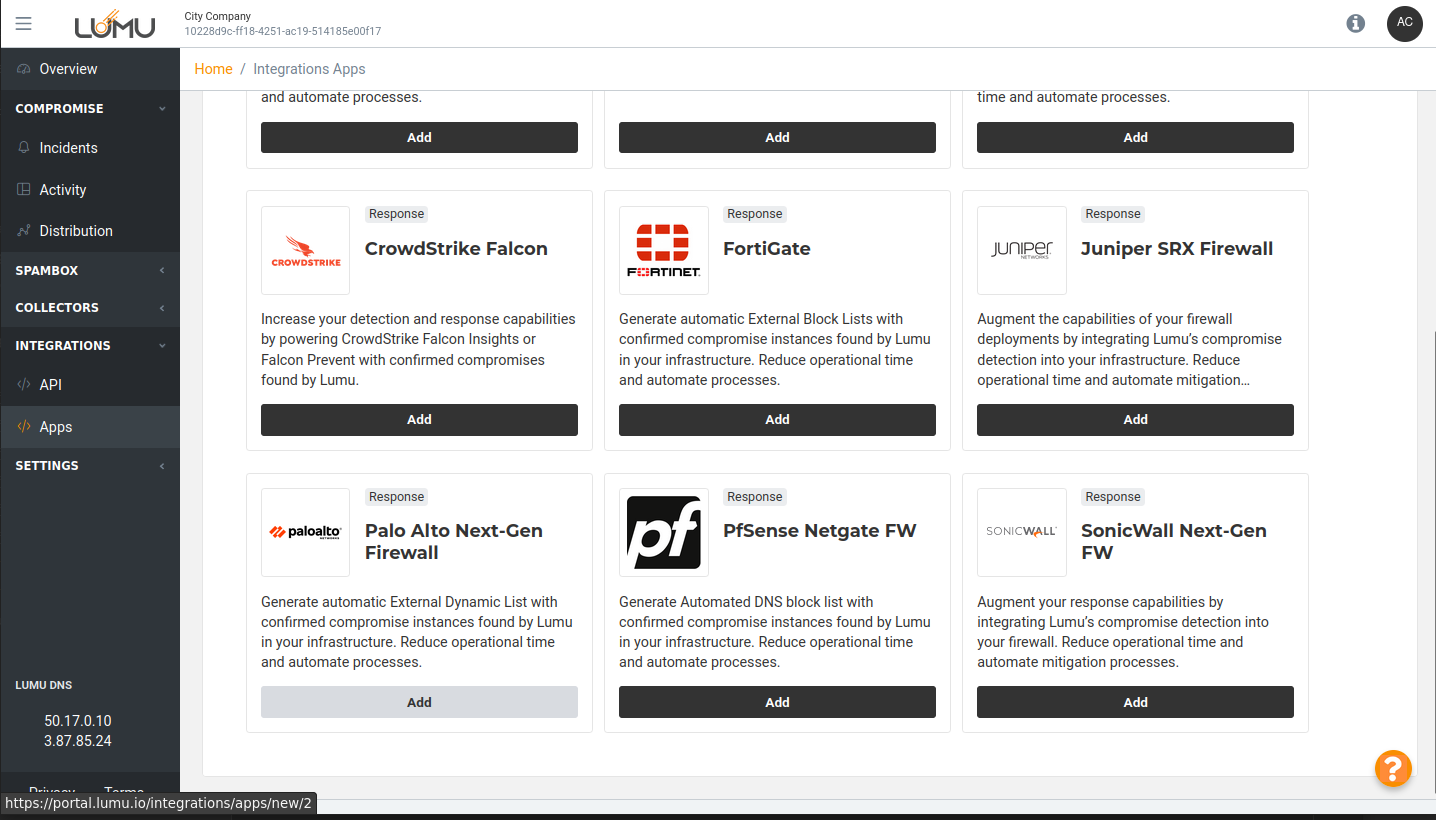 Lumu Portal and navigate to the integrations screen and select “Response”.
