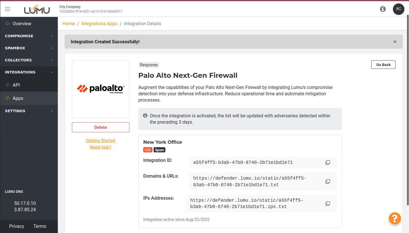 Deleting an integration will cause URLs to be removed. This action cannot be undone. To reintegrate you will have to generate the URLs again and update your Palo Alto Next-Gen Firewall configuration.