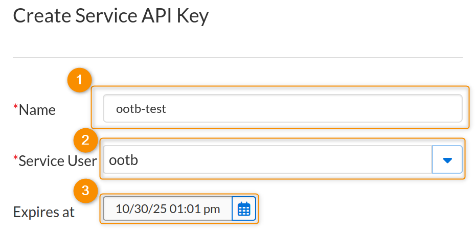 15. This will open the Service API Key creation dialog box. Assign an identifiable Name to it, select the integration’s Service User from the drop-down menu, and assign an Expiration Date to the Service API Key by clicking on the calendar icon. It is recommended to set an expiration date of at least one year, or by the duration determined by your organization’s specific needs and policies.