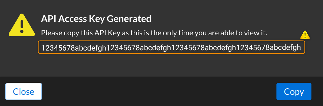 We reiterate, once you close the API Access Key Generated dialog, you won't be able to retrieve the service API Key again. If you misplace it, you will have to repeat this step of the procedure.