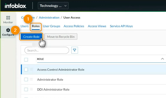 3. Now, you will create a role. This role will be assigned to the integration’s user and must have all the required permissions to interact with Infoblox’s REST API and operate custom lists. After opening the User Access view, select the Roles tab, and click on Create Role.
