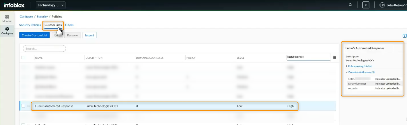 | BloxOne Threat Defense | Custom Lists View |